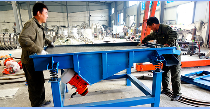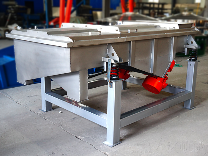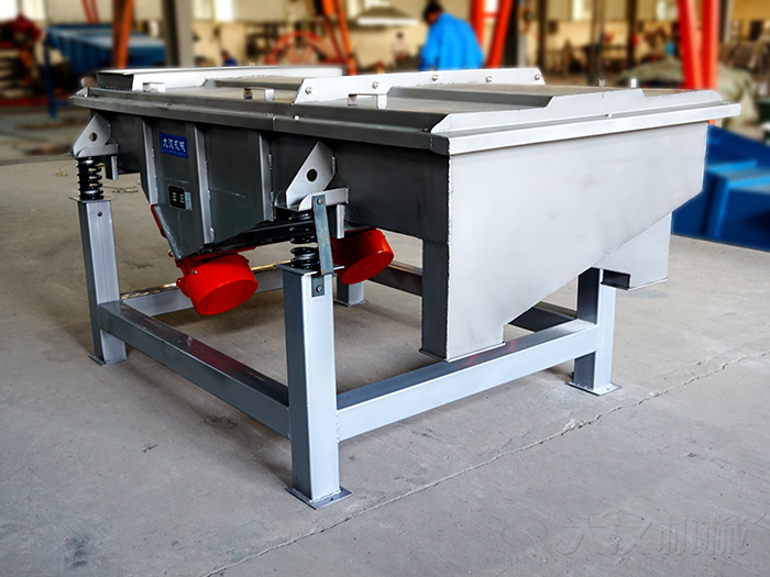 直線篩使用振動電機作為振動源,采用雙振動電機驅動,當兩臺振動電機做同步、反缶旋轉時,振動電機偏心塊所產生的激振力在平行于振動電機軸線的方向相互抵消,在垂直于振動電機軸線的方向重疊為一合力,因此振動篩機的運行軌跡為一直線。兩電機軸相對篩面有一傾角,在激振力和物料自重力的合力下,物料在篩面上被拋起跳躍式向前做直線運動,通過各不同層次篩網篩分多種規格的篩上物、篩下物,又從不同的出料口排出,流入料倉或盛料筒,從而達到對物料進行篩分的目的。
