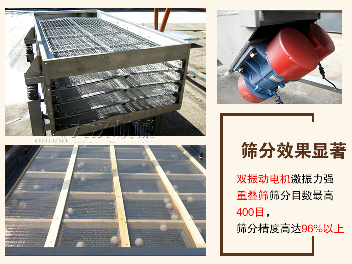 直線振動篩采用雙振動電機(jī)反向同步驅(qū)動,運(yùn)行可靠,激振力強(qiáng),有重疊篩選法、分層序列法以及聯(lián)合篩選法,篩分目數(shù)高400目,篩分精度高達(dá)96%以上,可篩選出7種粒度規(guī)格不同的物料。