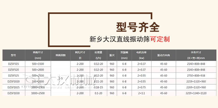 大漢廠家生產(chǎn)的直線振動篩型號有DZSF515、DZSF520、DZSF525、DZSF1020、DZSF1025、DZSF1030等,不同星海對應(yīng)的篩分產(chǎn)量不同,可以更好地滿足用戶的篩分需要,新鄉(xiāng)大漢直線振動篩可支持定制,您只需要告訴我您的要求,剩下的交給我們解決。