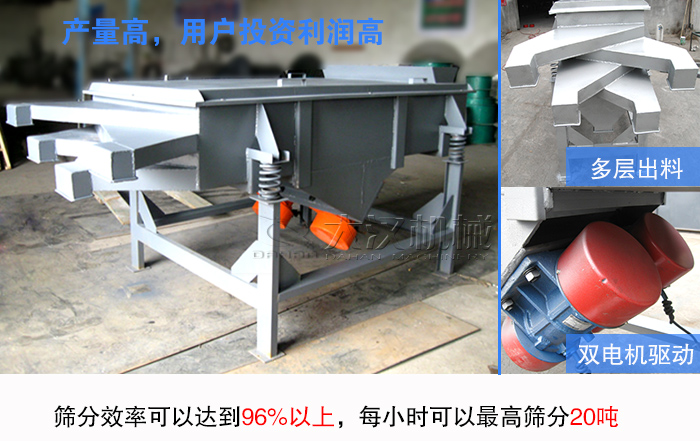 我們的直線式振動篩采用雙胎電機驅動,篩分效率更高,多層篩網同時篩分,大單臺機器可分選出6到7個不同粒度的物料,滿足不同客戶的需要,篩分效率可以達到96%以上,每小時可以高篩分20噸。而且,大漢廠家還根據客戶的情況設計針對性的解決方案,為客戶創造更大收益,降低運營成本,但是直線式振動篩價格需要根據用戶實際情況決定。