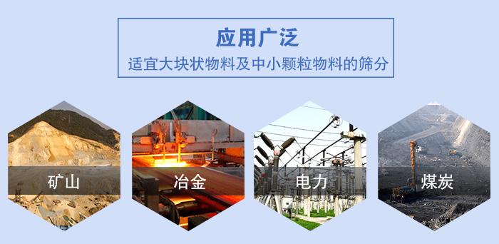 應(yīng)用范圍:主要用于冶金、礦山、煤炭、建材、電力、化工等大塊狀物料及中小顆粒物料的篩分行業(yè)