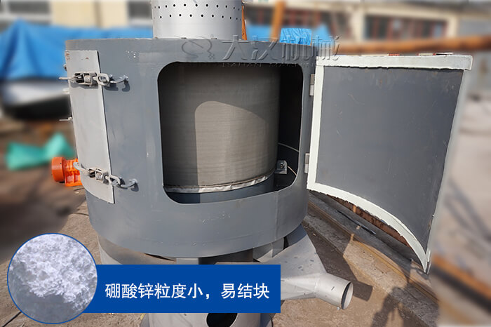 由于硼酸鋅密度般比較小,所以在篩分過程中容易粘在篩網(wǎng)上或造成結塊,嚴重影響篩分效率和精度,氣流篩風輪葉片的高速旋轉(zhuǎn)可以使結塊物料被打碎,相當于臺破碎機和臺篩分機的組合,提高了篩分效率。